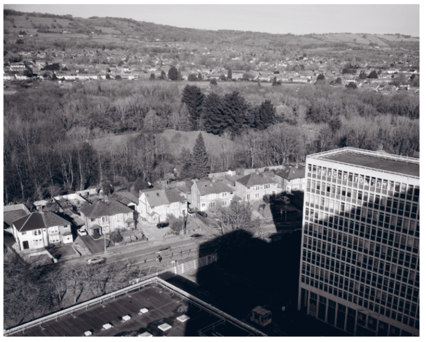 The dense shadow of a moribund building looms over neat rows of semi-detached houses in a north Cardiff suburb. The polite suburban landscape is being encroached upon by a slash of black, subtracting light and detail from the photograph. The shadow is cast by the 17-storey tax office, now demolished. Like taxes themselves, the shadow is ever-present and banal, an inescapable fact of daily life that shapes everything without announcing itself.
