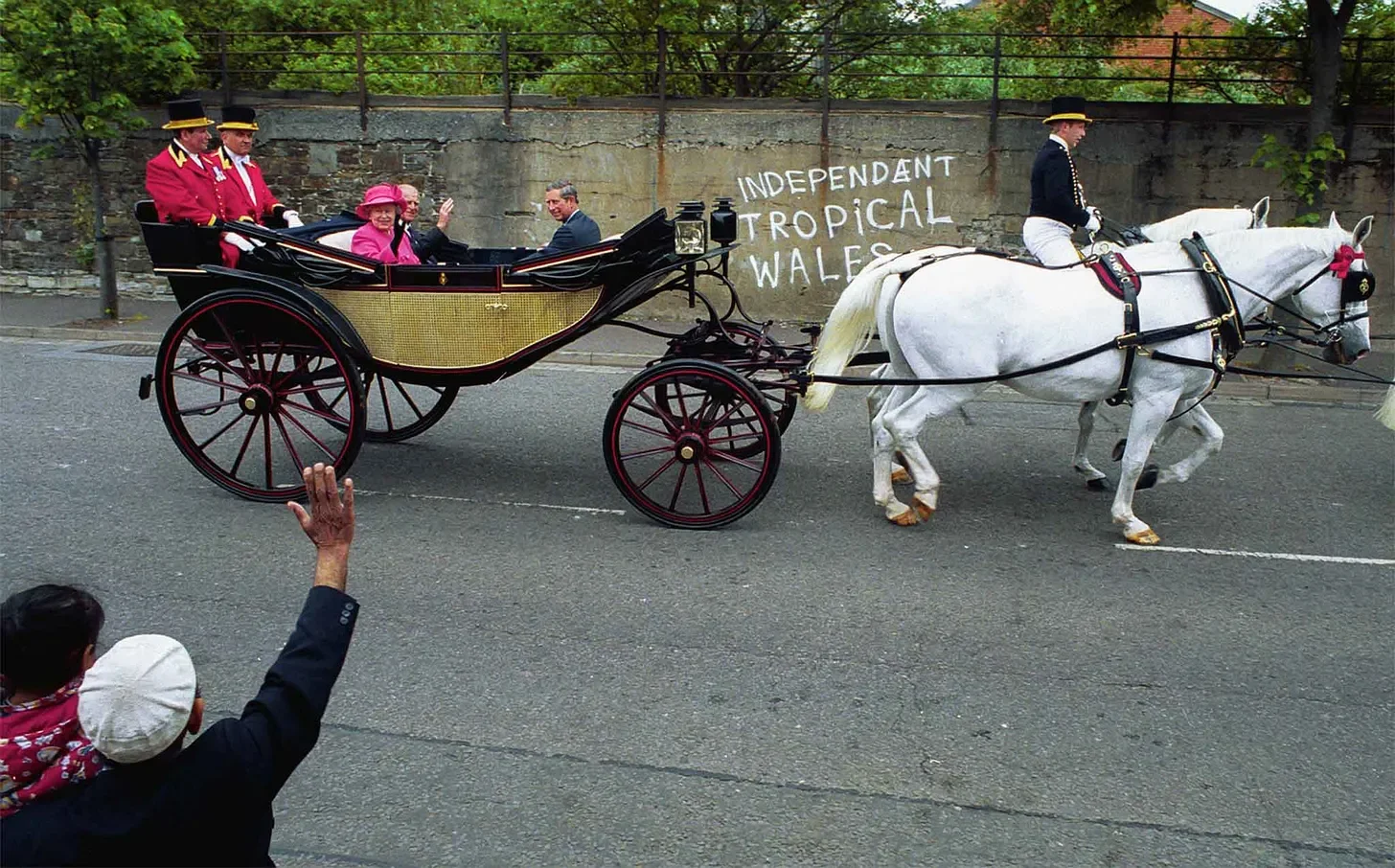 What makes this picture sing, and highlights the absurdity and patronising nature of what we see, is entirely down to the foresight of the photographer. The graffiti behind the royals screams: "Independent Tropical Wales." A hasty correction fixes the original misspelling of "independent," the writer having modified the letters to create something resembling the ligature æ. It's not clear if this is a Situationist declaration of statehood, or a demand for something more than is being offered by those in the carriage, but the effort made to correct the spelling matters. The message had to be right.